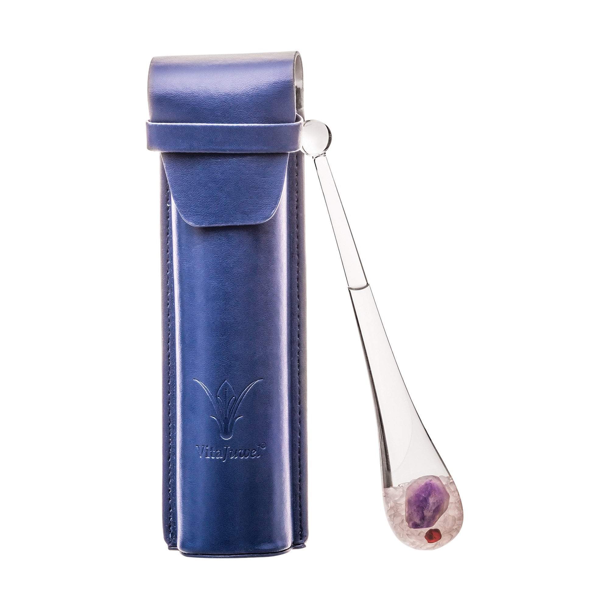 Your clients can take this gorgeous Gemstone Droplet with them to restaurants or their friends’ homes—anywhere they can vitalize a glass of wine. This handcrafted Gemstone Droplet is a mini version of the Gemstone Vial, filled with clear quartz, a fiery garnet, and an exquisite amethyst. Its water drop design is eye-catchingly elegant. To ensure that gem water and wine lovers have their personal Gemstone Vial ready to go, the Gemstone Droplet comes with a convenient leatherette case. Droplet is approximately 6.7" L.